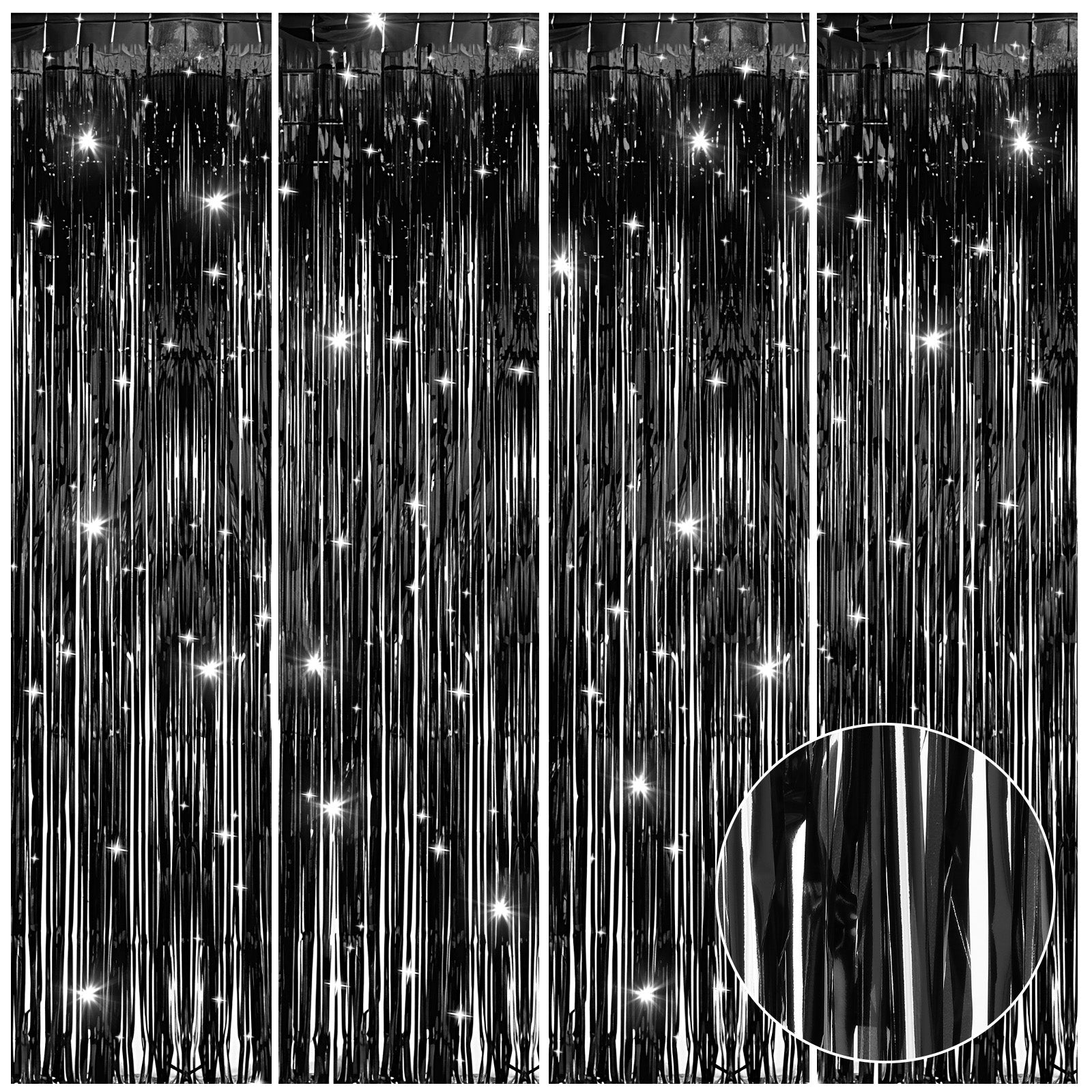 Elevate your event décor with MBAIYO's 4 Pack Black Foil Fringe Curtains! This complete set provides everything you need to create a stunning black backdrop for party celebrations. Each panel (3.28 ft x 6.56 ft) features luxurious metallic black tinsel strands that catch the light beautifully, making them perfect as black photo backdrop solutions. Whether you're creating black birthday decorations, wedding backdrops, or holiday themes, these versatile curtains serve as exceptional black party decorations.