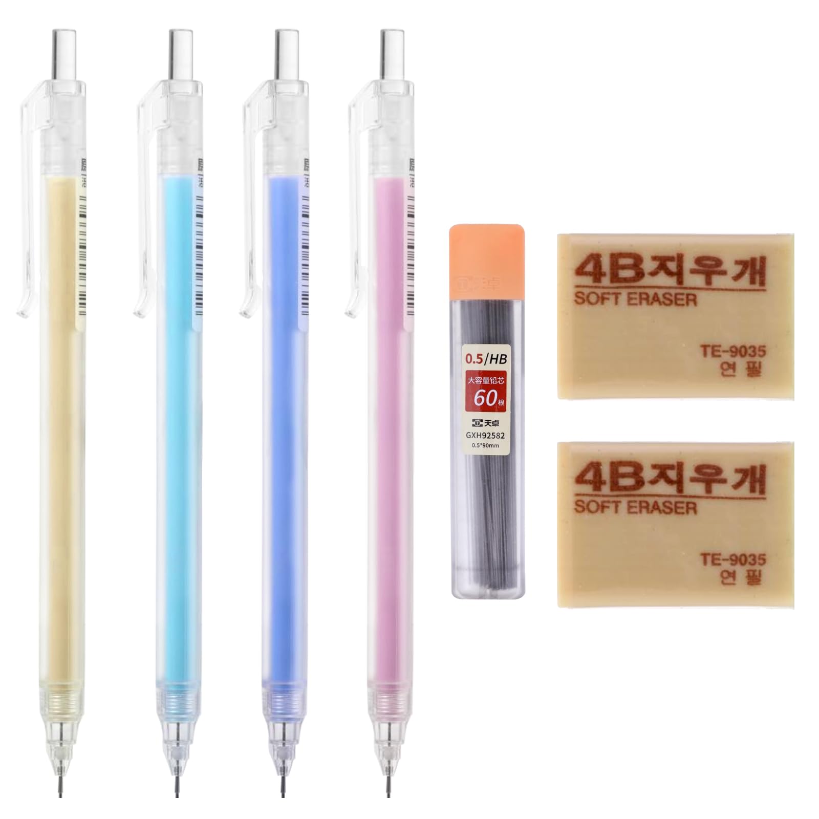 4 PCS Colored Mechanical Pencil Set, Pastel Mechanical Pencil with 60PCS HB Refills & 2PCS Erasers, Aesthetic Artist Pencil Colored Mechanical Pencils for Writing Drawing School Office Supplies