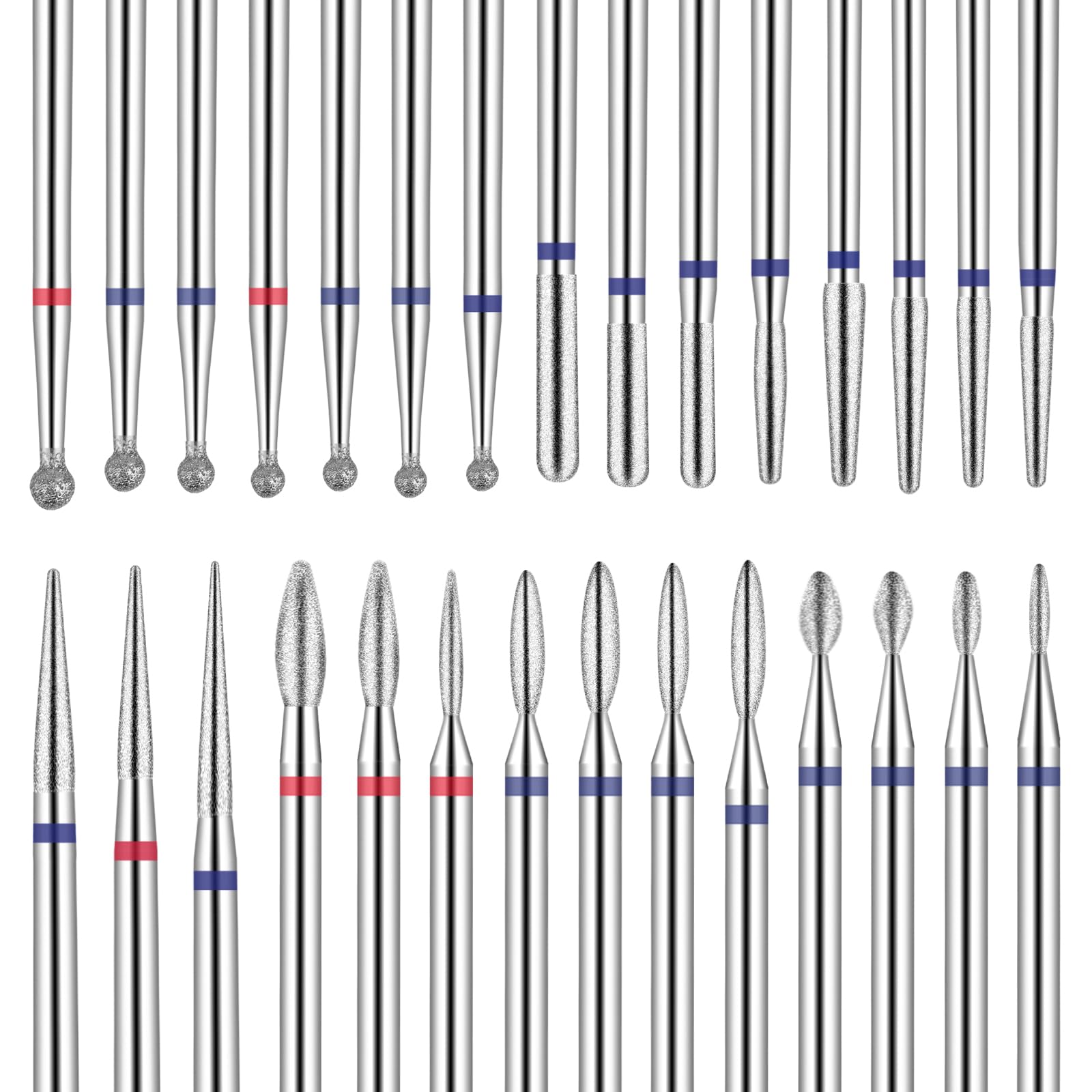 1. Collection of Different Nail Bit Heads for Varied Uses: Comes with 30Pcs nail file bits, including flame bit, nib bit, safety bit, cylinder bit, ball bit, micro ball bit, and needle bit with medium(blue) or fine(red) sizes.