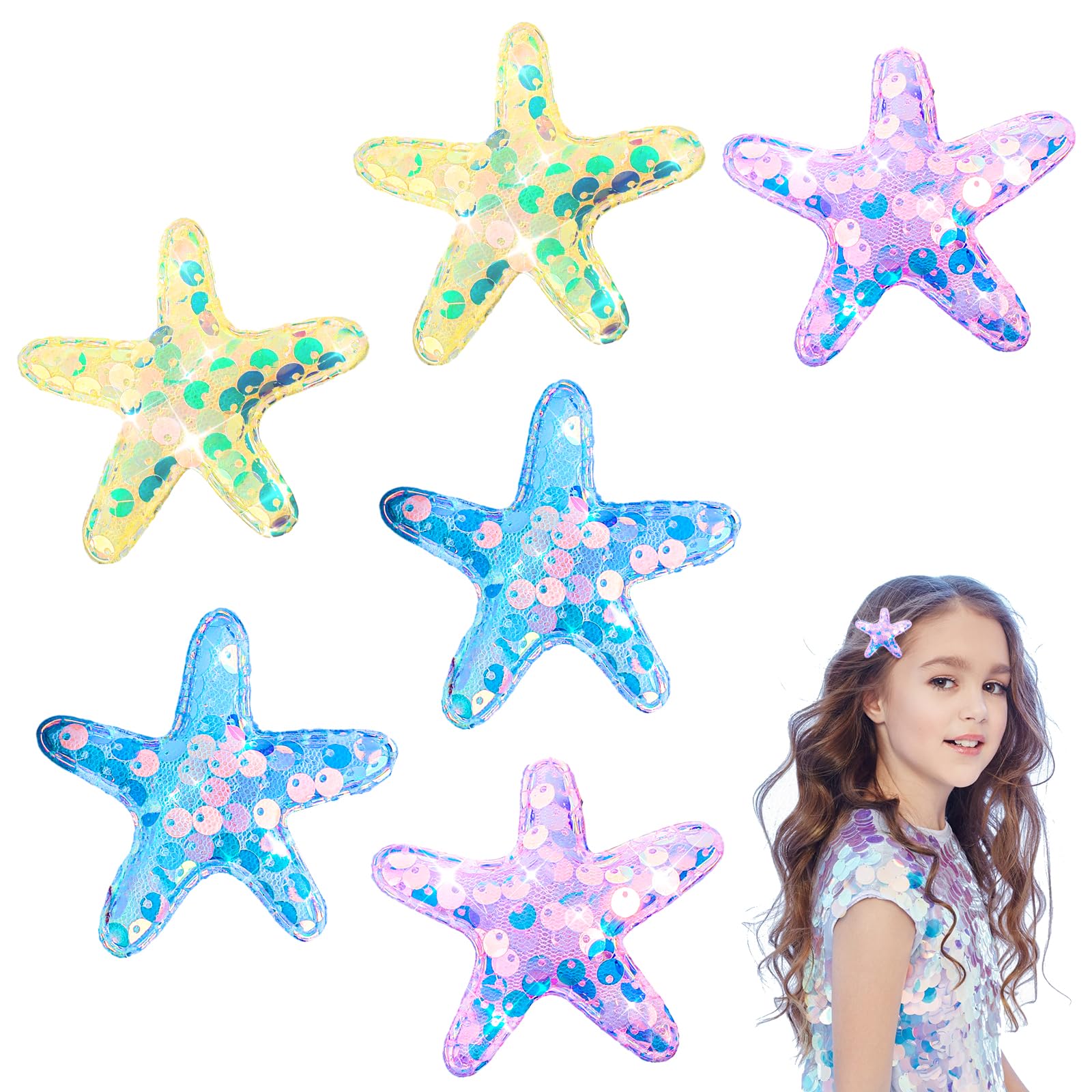 Amabro 6 Pcs Starfish Hair Clips, Glitter Sea Star Hair Barrettes Starfish Hair Accessories Sequins Snap Hair Clip Beach Sea Star Hairpins for Women Girls(Pink, Blue, Yellow)