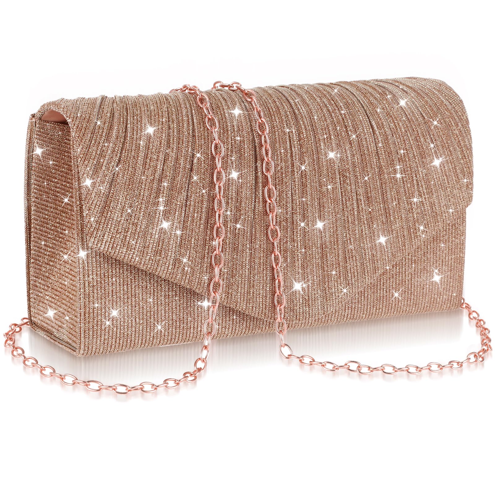 simarro Women's Evening Bag Clutch Purses, Shiny Pleated Striped Underarm Bag with Detachable Chain Ladies Party Handbag Clutch Bag for Prom Party Wedding Engagement(Champagne gold)