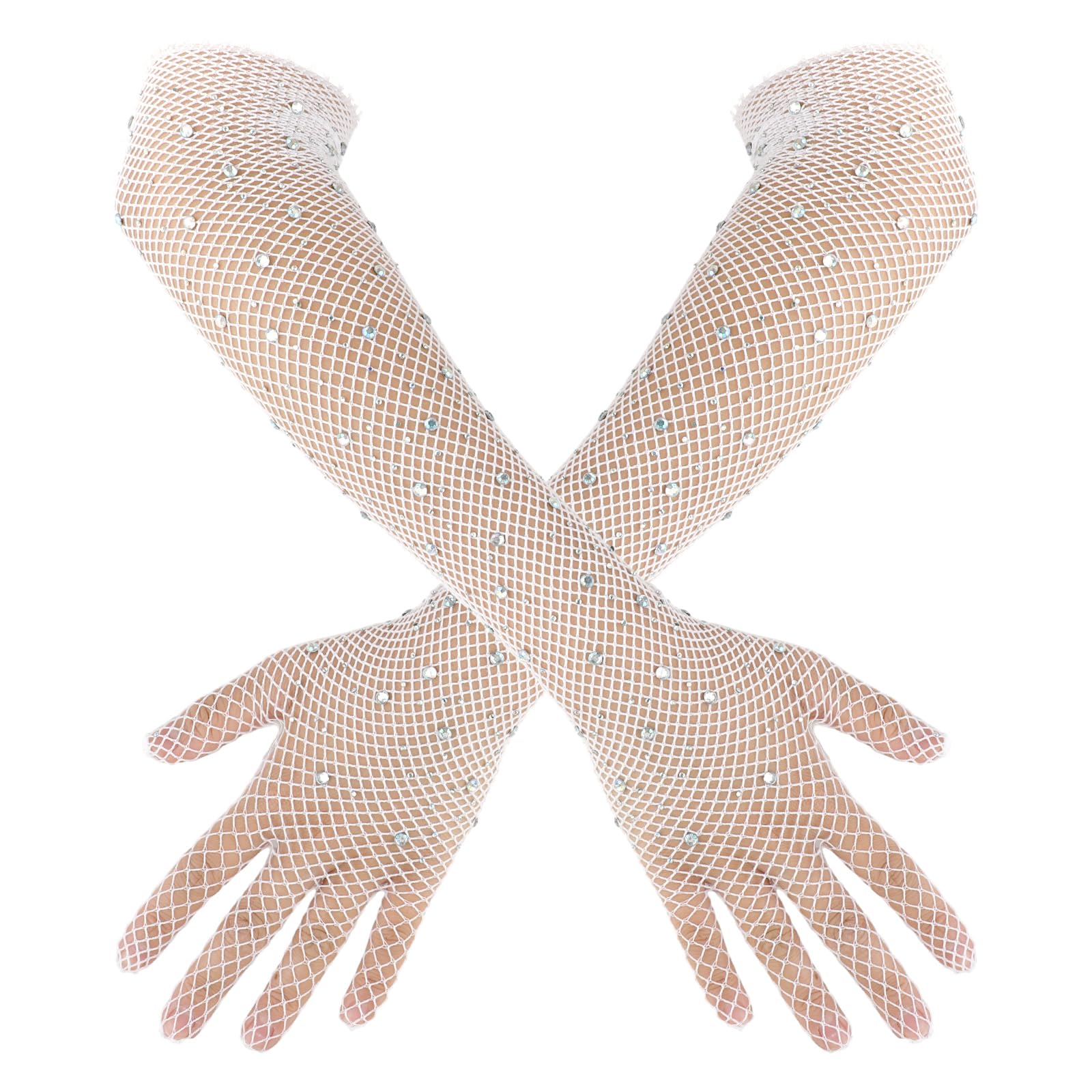 simarro Women's Rhinestone Fishnet Long Gloves, Bling Gown Gloves Mesh Arm Sleeves Opera Gloves Banquet Party Lace Gloves for Costumes Accessories(White)