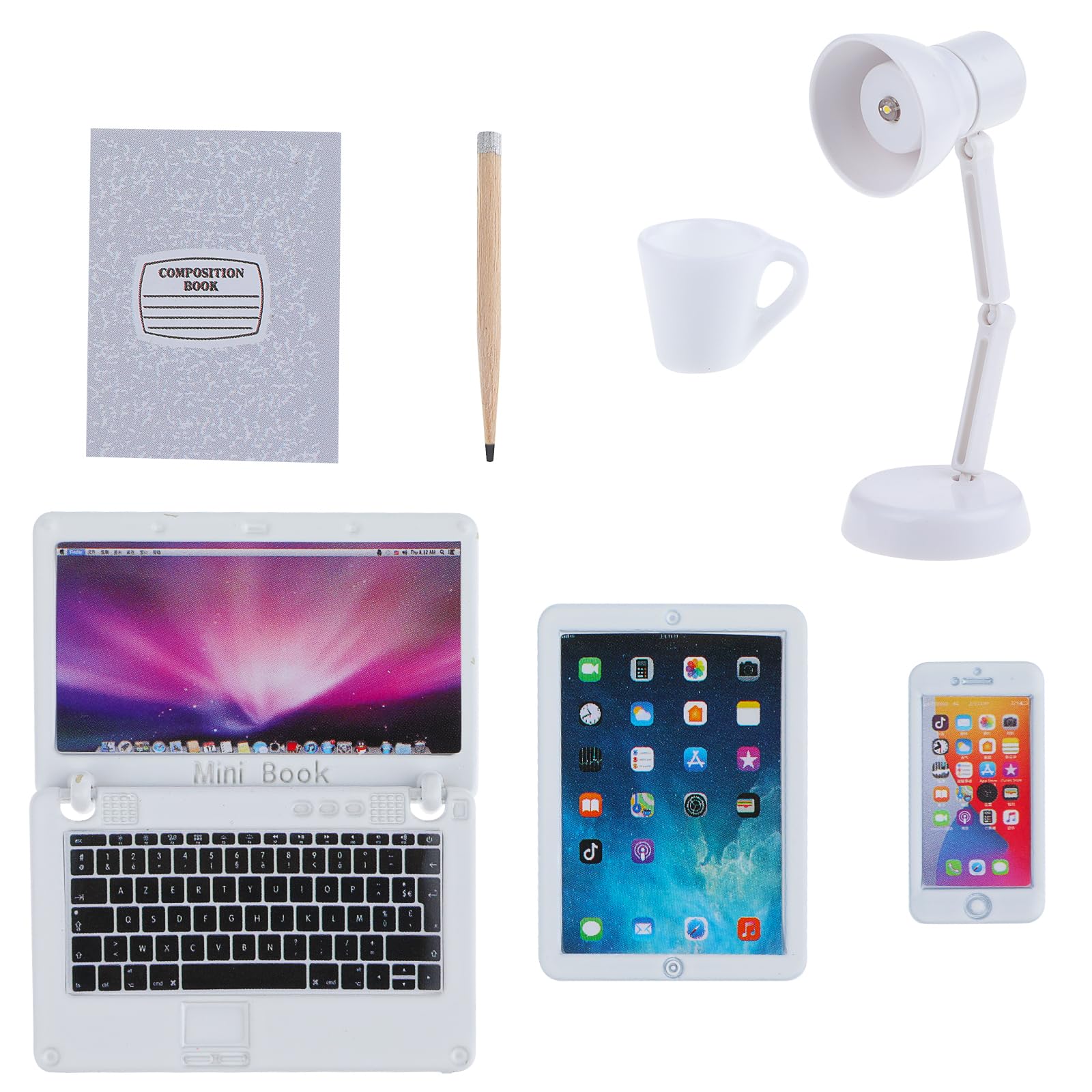 TIESOME 1:12 Dollhouse Mini Laptop Tablet Set, 7 Pcs Simulation Computer Phone Desk Lamp Miniatures Doll House Accessories Small Furniture Model for Dollhouse Decoration (White)