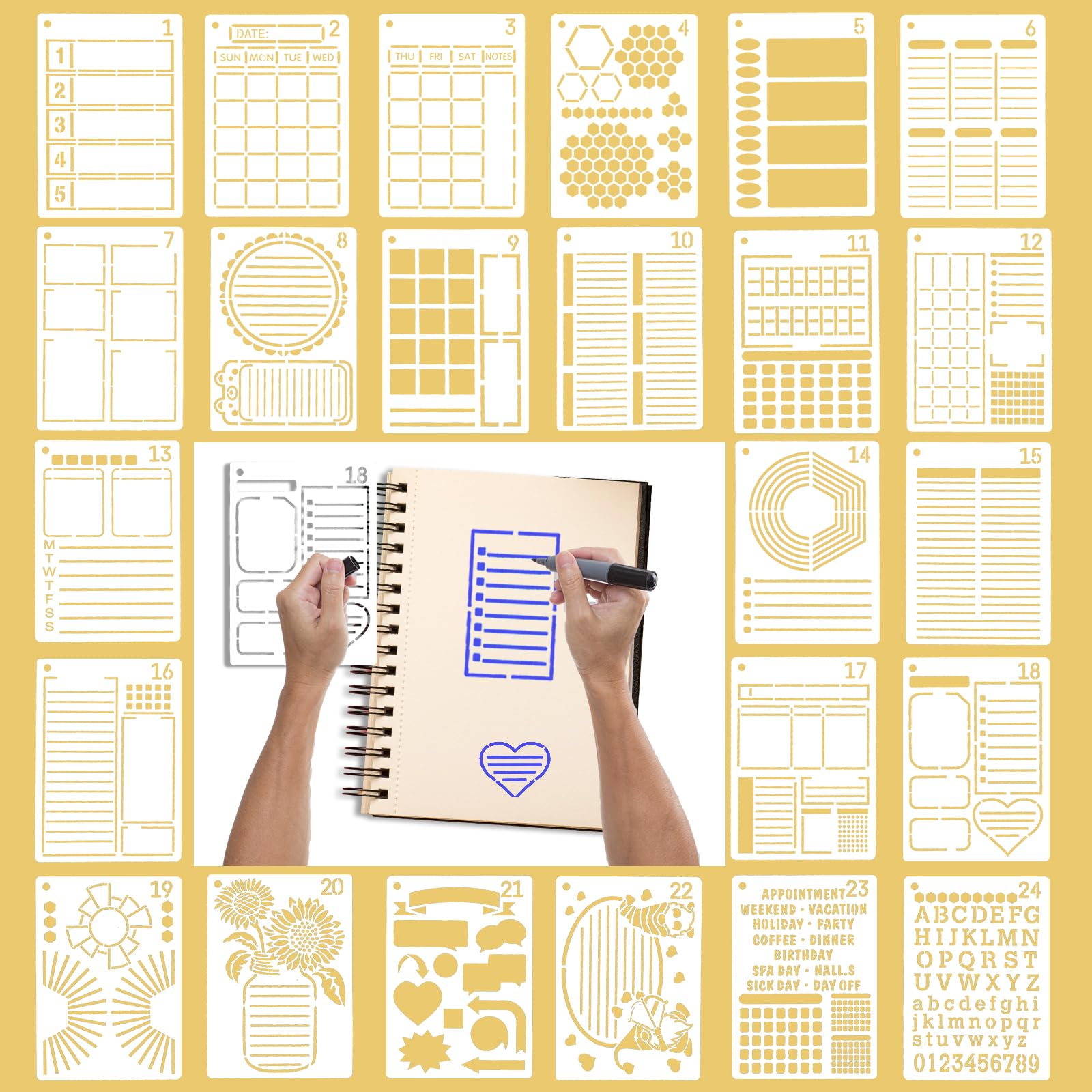 TIESOME 24 PCS Journal Stencils Templates Set with Stainless Steel Chain, 7 x 5inch Journal Stencils Templates Set Supplies Stencil Journal Stencils for Dotted Journals Notebook Scrapbook Calendar(B)
